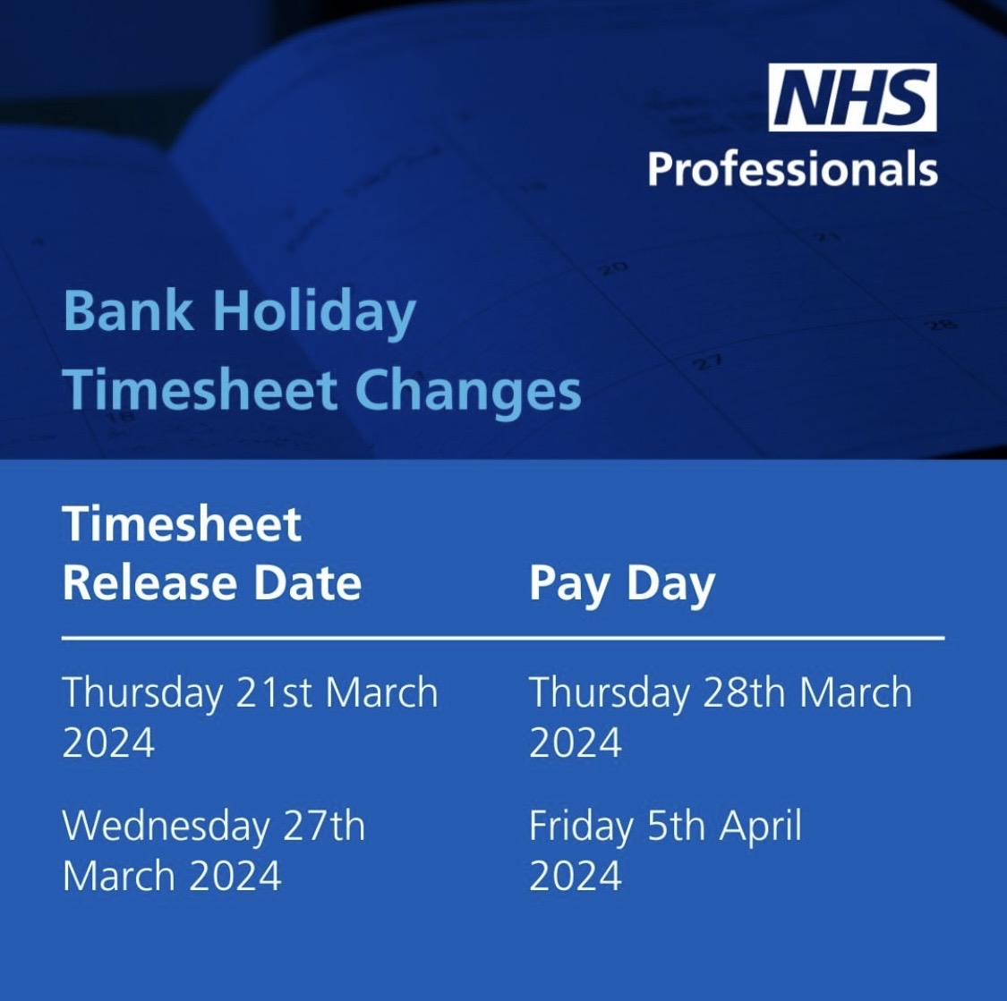 There are minor changes to our timesheet release and payment dates during March and April, please take a minute to review the dates below to make sure you don't experience any delays with your payments.